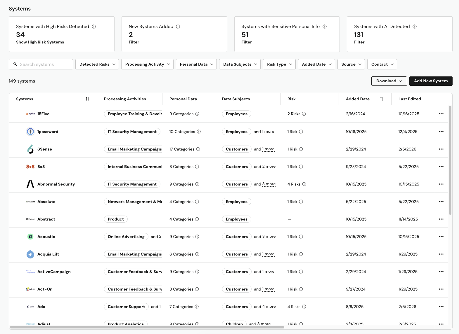The System Inventory allows you to have a comprehensive view of systems within your organization, what personal data they process, and the inherent risk associated with each system. Our goal is to help you understand where privacy risk lives across your organization through ongoing system detection, surfacing PII risk and allowing you to capture the measures in place to manage that risk.