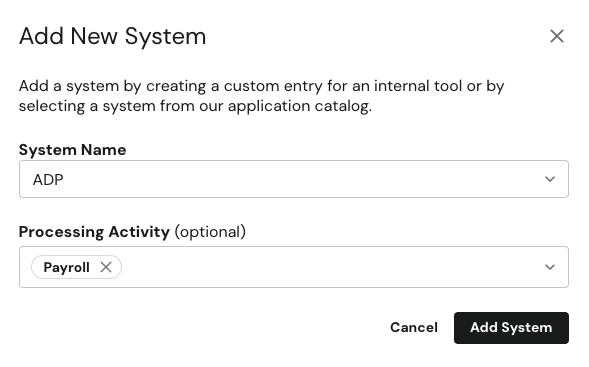 Optionally add a Processing Activity to categorize the system. Processing Activities can be added or updated at any time after adding the system.